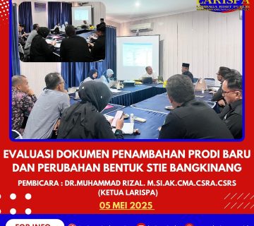 Evaluasi dokumen penambahan prodi baru dan perubahan bentuk STIE BangkinangPKMPI Sumatera UtaraSenin, 5 Mei 2025Evaluasi dokumen pen ... Read More